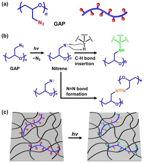 These phenomena were attributed to the decomposition of azide groups upon irradiation, releasing nitrogen (N2) and yielding highly reactive nitrene (N:) groups. These nitrene groups could insert into C-H bonds, or, alternatively, couple to form azo groups to form a crosslinked network (Scheme 1b,c). However, due to the low molecular weight of GAP and its high crosslinking degree, the film obtained was very fragile, and easily fragmented into small pieces when immersed in THF, as shown in Figure 1d.
