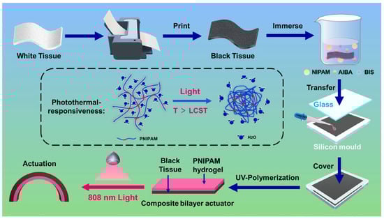 Poly(N-isopropylacrylamide) (PNIPAM) is the most typical thermosensitive hydrogel [,]. Its lower critical solution temperature (LCST) is close to 34 °C, and the hydrophilicity/hydrophobicity of PNIPAM changes around it, which is manifested in the shrinkage/expansion of volume. Since PNIPAM’s thermal phase transition behavior was discovered, it has been widely studied and regarded as an excellent thermal response material to be used in the preparation of hydrogel actuators. Tissue paper made from natural wood pulp is a low-cost, lightweight, deformable, and biocompatible material [,]. Lu et al. prepared Fe3O4/paper nanocomposites by a low-cost blending method, and then constructed a novel paper-based actuator with different shapes, showing good deformation, high stability, and reversible response []. The high mechanical strength ensures the potential of actuators to produce favorable output stiffness []. Moreover, paper quality can be easily modified. These reasons mean actuators built from tissue paper have attracted great attention.