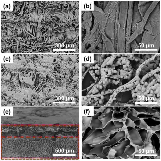(a,b) The SEM images of tissue paper. (c,d) The SEM images of black tissue paper. (e) Tissue paper/PNIPAM hydrogel composite actuator structure. (f) The SEM image of pure PNIPAM hydrogel.