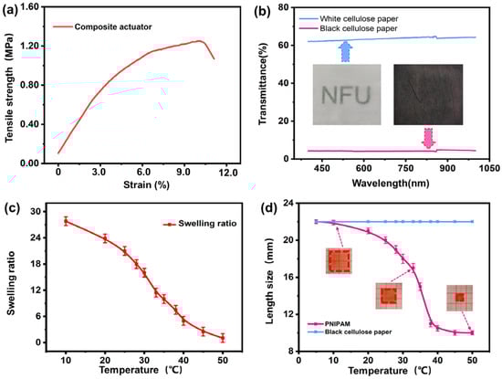 (a) The mechanical property of the tissue paper/PNIPAM hydrogel composite actuator. (b) Comparison of the light transmittance between the original tissue paper and the black tissue paper dyed by the printer. The (c) equilibrium swelling rate and the (d) length of the PNIPAM hydrogel at the temperature range from 5 to 50 °C.