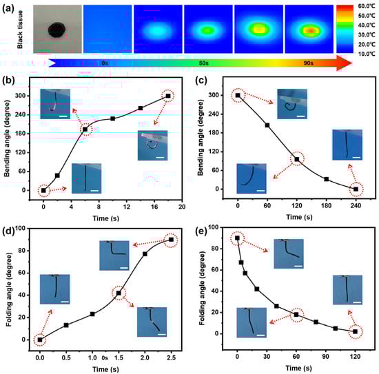 The light-responsive (photothermal-responsive) deformations of this bilayer composite actuator were researched with an 808 nm NIR lamp (Figure 4). This anisotropic bilayer structure of the strip-shaped actuator can provide programmable deformations owing to different light-responsiveness levels between the PNIPAM hydrogel layer and the tissue paper layer. In fact, the black tissue paper layer can almost keep the original shape and volume under the irradiation of NIR light and subsequent increase in temperature (Figure 4a), and some of the PNIPAM hydrogel formed in it via in situ polymerization. However, this NIR-heated tissue paper can conduct the heat to the thermal-responsive PNIPAM hydrogel, which can shrink immediately (Figure 3c,d) because the crosslinked PNIPAM network of the hydrogel can become relatively hydrophobic and then discharge most of water in the network to the external environment. As a result, the light-responsive deformations can be achieved owing to the internal stress of the actuator between the shrunk hydrogel layer and the unchanged tissue paper layer []. To further corroborate this, we put the composite actuator in 15 °C cold water and irradiated it under NIR light of wavelength 808 nm with intensity 3.5 W/cm2, and recorded its temperature change with an infrared thermal imaging instrument. As shown in Figure 4a, the black tissue paper can be heated to about 60 °C in only 90 s, which fully illustrated that the black tissue paper had highly efficient photothermal conversion performance. The combination of black tissue paper and PNIPAM hydrogel made the actuator have an anisotropic bilayer structure, gave it photothermal responsiveness, and made it possible to regulate the deformation of the tissue paper/PNIPAM hydrogel composite actuator by remote control.