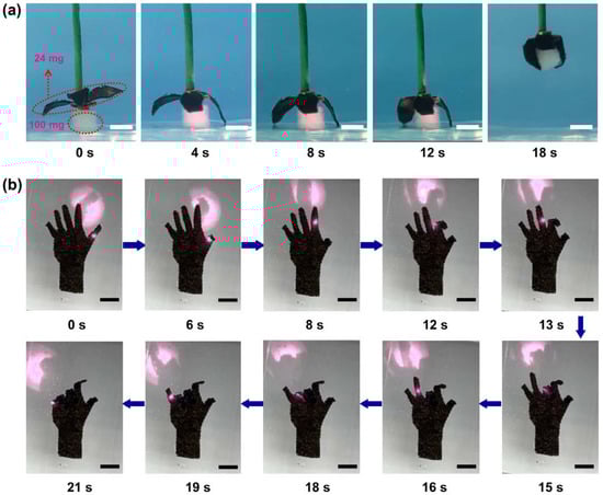 (a) The remotely controlled light-responsive grabbing behavior of the biomimetic “paw” based on the composite actuator under an area irradiation (with a 1 cm spot diameter and 5 W of power by an 808 nm laser). (b) The remotely controlled light-responsive finger-folding performance of the biomimetic “hand” based on the composite actuator under a point irradiation (with a 0.2 cm spot diameter and 2 W of power by an 808 nm laser).