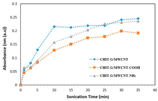 The production of dispersions including MWCNTs, MWCNTs-COOH, and MWCNTs-NH2 with CHIT-G was monitored using absorption spectrophotometry. We were able to create MWCNT dispersions utilizing ultrasonic for only a few minutes (20 min). The sonication time was a major concern as it had to be long enough to properly suspend the MWCNTs, but not so long as to cause defects in the nanotubes, shorten their length or otherwise negatively affect their properties [,,]. Absorption spectrophotometry is particularly appropriate for assessing the impact of sonication time or sample conditions on the extent of MWCNT suspension. This is attributable to the fact that it is a valuable method for determining how much de-bundling of nanotubes in suspensions has occurred. The absorbance of all dispersions was measured at wavelengths ranging from 300 to 1000 nm. Increased sonication time increased absorbance that is compatible with other investigations in the literature [,]. To find an acceptable sonication duration for forming the other forms of suspensions, the absorbance at a single wavelength (660 nm) was evaluated as a function of sonication time as shown in Figure 1. To prevent absorbance due to the solvent and the dispersant (chitosan or crosslinked chitosan), a wavelength of 660 nm was chosen. The absorbance at 660 nm changed for each suspension in response to increasing sonication duration, as shown in Figure 1. After 10, 20, and 25 min of sonication for the CHIT-G/MWCNTs, CHIT-G/MWCNT-COOH and CHIT-G/MWCNT-NH2, respectively, absorbance had reached or was approaching a plateau zone. This suggests that the time frame was long enough to create a well-dispersed MWCNT sample suitable for PS membrane preparation. When the sonication period was extended, the absorbance at 660 nm did not change much again.