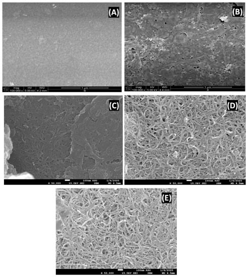 Figure 2 displays SEM images of the membranes synthesized in this investigation. In the instance of the PSf membrane that has been coated with chitosan (Figure 2A), nanopore creation takes place during the coating process. When chitosan is crosslinked in the existence of glutaraldehyde, it often results in phase separation, which leads to pore development [] (Figure 2B). In comparison to the MWCNT/CHIT-G/PS membranes (Figure 2C), SEM images of MWCNTs-COOH/CHIT/PS (Figure 2D) and MWCNTs-NH2/CHIT/PS (Figure 2E) membranes displayed a multitude of nanotubes that were tightly intertwined on their surface. This is due to the CHIT chain wrapping around MWCNTs-COOH and MWCNTs-NH2 as a consequence of the COOH and NH2 groups on MWCNT walls interacting with the CHIT-NH2 chain and -OH moieties of the CHIT chain []. CHIT’s quiet compatibility with MWCNTs-COOH and MWCNTs-NH2 is consistent with prior studies []. On the other hand, we can assume that the content of MWCNTs in chitosan is smaller than the content of MWCNTs-COOH, which is mainly owing to the limited molecular attraction between MWCNTs and CHIT along with the hydrophobic character of MWCNTs [,]. As a result, MWCNTs in the CHIT matrix have a propensity to group together. MWCNTs are thus less equally distributed in the CHIT matrix than MWCNTs-COOH and MWCNTs-NH2.