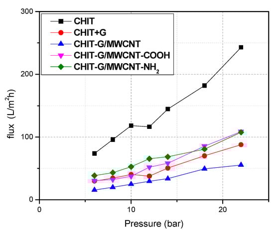 Membrane hydrophilicity, chemical composition, and surface charge all have a major influence on the water flow rate because they change the combination between the solution and membrane surface []. Figure 3 shows the dependence of the flux on the pressure on the membrane. The permeability of all membranes was determined utilizing the trend line of working pressure and permeate flow. With greater working pressure, the fluxes of the permeate of all PSf membranes increased; findings are illustrated in Table 1. After each PSf membrane was used for 8 h, the CHIT-G/MWCNT-COOH/PSf membrane had higher water permeability (5.6 ± 0.3 L m−2 h−1 bar−1) and remarkably greater flux (Figure 3) in comparison with other membranes. This is owing to the carboxylic group’s ability to attach water molecules through hydrogen bonding. When compared to prior experiments, all of the studied membranes showed improvements in water permeability [,]. The water permeability of all PSf membranes prepared in this work was in the range 3.6–5.6 L m−2 h−1 bar−1. These findings outperform prior studies employing unsubstituted MWCNTs and other crosslinking agents.