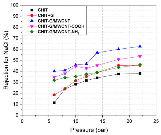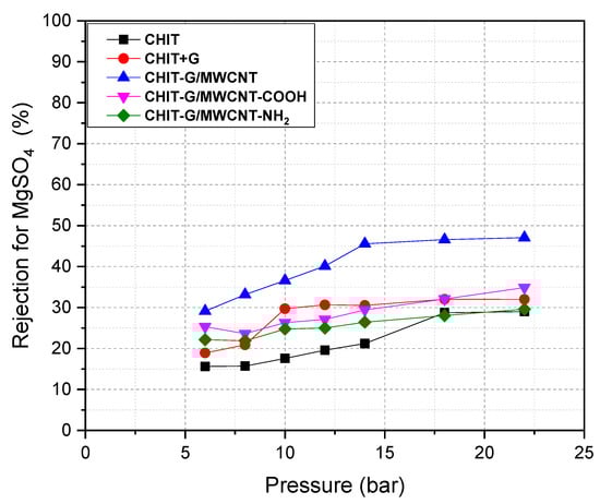 Salt rejection by all PSf membranes was examined utilizing a crossflow RO/NF system with NaCl and MgSO4 solutions (as a single salt solution (2000 ppm), and tests were conducted at 20 °C with varied working pressure. Salt rejection by all PSf membranes (as indicated in Equation (2) in the Experimental Part) was drawn versus permeate flow (Figure 4 and Figure 5). In general, as the operating pressure increased, salt rejection increased. More significantly, Figure 4 and Figure 5 demonstrate an exponential relation between working pressure and salt rejection. The NaCl and MgSO4 solutions exhibit a dramatic rise in salt rejection with increasing operating pressure. The rejection of NaCl using CHIT-G/MWCNT/PSf, CHIT-G/MWCNT-NH2/PSf and CHIT-G/MWCNT-COOH/PSf membranes was highest (38–62%) compared to other membranes (CHIT/PSf and CHIT-G/PSf). Additionally, these membranes displayed higher MgSO4 rejection (Roughly 29–49%) than the CHIT/PSf (15–29%) and CHIT-G/PSf (19–30%) membranes. It should be noted that MgSO4 rejection by PSf membranes was quite lower than by NaCl. The order of rejection reported here coincides with the hydration ionic radius of Na+ (0.360 nm) < Mg2+ (0.395 nm). There is no information in the literature on the ionic radius of SO42-. Our findings agree well with a previous investigation by Tongwen et al. [], who also reported that inorganic salt rejection was in the order R(NaCl) > R(MgSO4). The rejection of NaCl and MgSO4 by the CHIT-G/MWCNT/PSf membrane was also somewhat higher than that of the CHIT-G/MWCNT-NH2/PSf and CHIT-G/MWCNT-COOH/PSf membranes, as shown in Figure 4 and Figure 5. This could be related to the porosity and columbic repulsion for unsubstituted MWCNTs, which may lead to increased rejection. These findings are in line with the SEM images of the prepared PSf membranes.