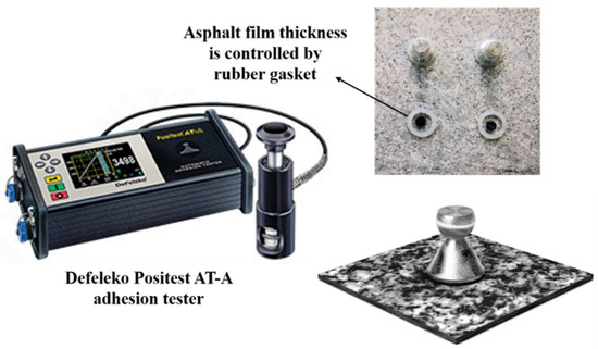 The BBS test is conducted based on AASHTO TP-91 [42], and a American Defelsko Positest AT-A adhesion tester was used to evaluate the binder bond strength of different kinds of asphalt. The diameter of the stub was 20 mm and the tensile strength loading rate was 0.7 MPa/s. The thickness of the asphalt film was maintained by the crumb rubber gasket at 0.8 mm [23]. At this time, in addition to adhesion failure, cohesive ductile damage still interfered. The aggregates’ base materials were limestone, basalt, or granite, as shown in Figure 1. Prior to the test, each specimen was subjected to 48 h of moisture conditioning in a 40 °C water bath. In water conditioning, 15 h of conditioning can affect the bond strength and failure mode. As a result, most samples exhibited an adhesive failure. The peak tensile strength was recorded to quantitatively evaluate the adhesion properties between the different asphalts and aggregates [25]. Pull-off tensile strength (POTS) is the maximum tensile strength of the stub pulling away from the aggregates in the BBS test.