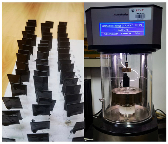 The surface free energy of asphalts with different rubber powder contents was tested by using a German DataPhysics dynamic surface tensiometer, as shown in Figure 2. A glass slide with a flat asphalt film was formed by the Wilhelmy hanging plate method, and the contact angle of the asphalt was measured [39]. The surface free energy of the asphalt was quantified using two liquids with known surface energies that are insoluble in asphalt and do not chemically react with asphalt. The test was conducted at a temperature of 25 °C, and each set of experiments was run in parallel with three times to rule out accidental errors.