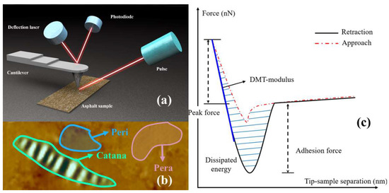 Microscopic images and nanomechanical characterizations of the four asphalt surfaces were obtained using a Bruker Dimension Icon Atomic Force Microscope (AFM), as shown in Figure 3a. The selected probe cantilever was a TAP300-G with a thickness of 4 μm, a width of 30 μm, a length of 125 μm, a nominal spring constant of 40 N/m, and a nominal resonance frequency of 300 kHz. The probe was uncoated, and the probe tip was made of monolithic silicon. The scanning frequency of the probe was set to 1.0 Hz, and different kinds of asphalt surfaces were scanned in tapping mode to obtain 20 μm × 20 μm topographic images and force curves of the asphalt surfaces [47]. Typically, three primary microstructures developed on the asphalt surface at around room temperature after annealing of asphalt from its melting temperature. The wrinkled areas were named the catanaphase (bee structures), the islands around the wrinkled domains were called the periphase, and the paraphase was the smoother phase neighboring the periphase, as shown in Figure 3b. The AFM images were analyzed by using the software Nanoscope Analysis 1.9 to quantitatively calculate the roughness of the samples. The adhesion force was determined from the measured force curve, as shown in Figure 3c.