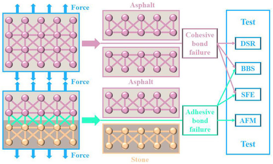 As shown in Figure 4, the cohesion energy or cohesive bond energy is defined as the value of the energy needed to create two new surfaces with unit areas [43]. The amount of energy required for deboning the binder–aggregate interface of the asphalt is called the adhesion energy (or adhesive bond energy) [43,44].