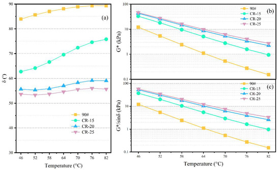 The rheological parameters of the four different binders under temperature sweep are shown in Figure 5. From Figure 5a, it can be seen that the phase angle of the base asphalt is relatively high, at 80–90° in the tested temperature range, while the phase angle of the rubberized asphalt is relatively low. The phase angle of CR-15 is within 60–80°, and it is greatly affected by temperature changes. The phase angle of CR-20 and CR-25 does not change much over the tested temperature range, within 50–60°. Unlike the base asphalt and CR-15, the phase angle of CR-20 and CR-25 decreases slightly within 76–82 °C. In general, the crumb rubber powder can reduce the phase angle of the binder.