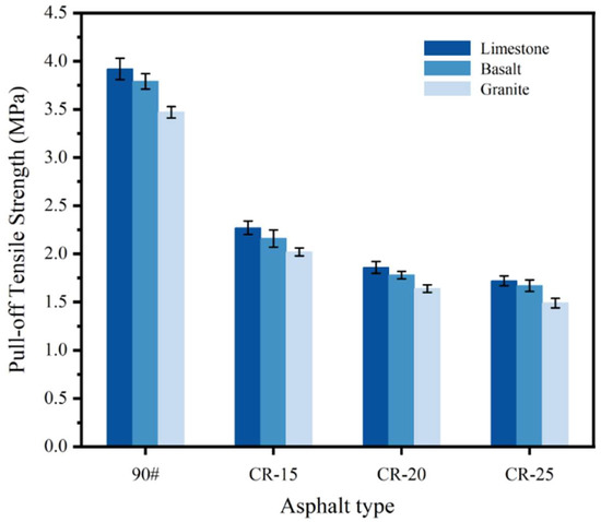 There are also obvious differences in the adhesion between rubberized asphalt and different aggregates. It can be seen from the Figure 6 that the adhesion between rubberized asphalt and limestone is the best, followed by basalt, while the adhesion with granite is relatively poor. Taking CR-20 as an example, its POTS with granite is 1.64 MPa, and its POTS with basalt is 8.5% higher than that with granite, reaching 1.78 MPa, while its POTS with limestone is 13.4% higher than that with granite, reaching 1.86 MPa. The above results are caused by the differences in the properties of the different lithological aggregates, including the differences in the surface texture and composition of the aggregates [16].