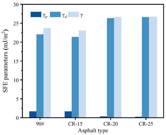Figure 7 shows the calculation results of the SFE parameters of the four different asphalts. The polar components of the four asphalts are all much smaller than the dispersion components. Overall, the polar component decreases with the increase in dosage. The dispersive component and total SFE of the asphalts with the higher crumb rubber powder contents are higher. The total surface energy of the four asphalts is between 23 mJ/m2 and 27 mJ/m2. Surface energy theory states that the surface energy of a substance in a stable state is low. As shown in Equation (2), asphalt with a higher surface energy has higher cohesive energy. Based on the SFE parameters of the base asphalt and the three kinds of rubberized asphalt, 90# ≈ CR-15 < CR-20 ≈ CR-25.
