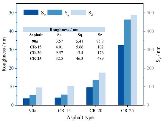 As shown in Figure 11, it can be seen that the three indicators are consistent for the roughness changes with different dosages of CR powder. The smaller the roughness value, the smaller the difference between phases and the more stable the microstructural properties [58]. As shown in Figure 11, the roughness value is the highest and the microscopic morphology is the most unstable when the rubber powder content is 25%. The roughness value increases continuously with the increase in the rubber powder content. This shows that the content of rubber powder particles will continuously destroy the apparent morphology of the asphalt and reduce the stability of its microscopic properties. The roughness values did not change significantly at low rubber powder contents.