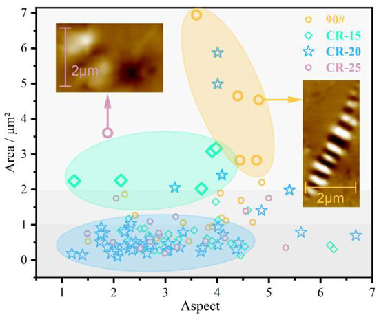 The schematic diagram of the scatter of morphological changes in the catanaphase is shown in Figure 12. The area is the area of the catanaphase, and the aspect is the ratio of the major and minor axes of the catanaphase. With the increase in the amount of CR powder, the slender catanaphase of the base asphalt becomes more dispersed when the amount of CR powder is 15%, and the length of the catanaphase also decreases. When the dosage is 20%, the original large catanaphase is broken into several smaller sections of catanaphase by the crumb rubber powder. When the dosage reaches 25%, the catanaphase effectively does not exist, and even if the catanaphase exists, it is blurred and counted in order to have a certain contrast, and it can actually be considered to be non-existent.