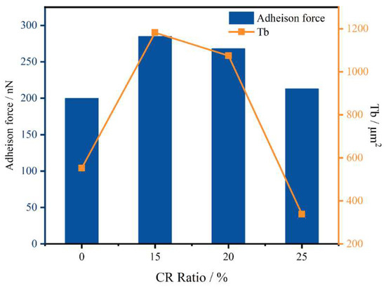 As shown in Figure 13, the adhesive force shows a trend of first increasing and then decreasing with the increase in the CR powder content. Because the probe itself will be affected by van der Waals forces, the rubber forms a gel structure to improve the cohesion by absorbing the light components. The cohesion of the rubber-modified asphalt interferes with the test results, such that the adhesion of the rubber-modified asphalt is greater than that of the original asphalt. However, the comparison rule of rubber-modified asphalt is consistent with the previous test, indicating that atomic force microscopy is more suitable for the comparison of two-phase systems. When the dosage is higher, the CR microparticles can aggregate on the surface of the asphalt, destroying the surface tension. The stability of microscopic properties decreases, leading to a decrease in adhesion. In this process, the catanaphase is squeezed and broken by the continuously aggregated microgel powder particles until it completely disappears. The change trend of the catanaphase change coefficient Tb (as shown in Equation (8)) is consistent with the change in the adhesive force, indicating that the microstructure is strongly related to the performance, and the change in the catanaphase can be used to evaluate the modification effect of the CR powder.