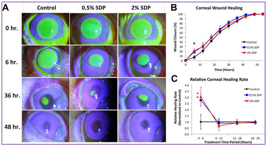 Treatment of rabbit ulcers with silk protein. Fluorescein signal (i.e., the site of the wound) within the presence of the areas mentioned in rabbits after epithelial rupture. (A) Representative post-surgical fluorescein staining, (B) summary of wound closure (percent over time), and (C) normalized healing rates between 6 and 24 h post debridement increasing in healing rate with both SDP concentrations. Image reproduced from reference [12], which was published under a CC BY license.