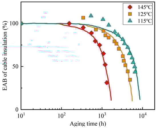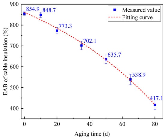 Some scholars have studied the relationship between the mechanical properties of cable insulation and the aging time, and the exponential function relationship between EAB and the aging time t through curve fitting was deduced, which can be fitted by Equation (9) [14,20]: