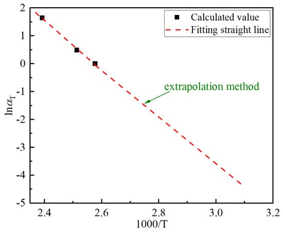 These results show that the log of the multiplicative shift factor has an obvious linear relationship with the inverse absolute temperature T, which is basically consistent with the TTSP according to Equation (7). The observed line in Figure 3 could be extrapolated as shown, allowing predictions to be made at lower temperatures. Thus, the applicability of the Arrhenius equation in the transformation of the changing process of EAB of XLPE materials under different thermal aging conditions has been verified, and the TTSP can be the basis of a prediction methodology for the long-term behavior of XLPE materials based on short-term tests at different temperatures.