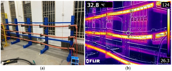 Figure 4 presents the physical picture of the heating platform and the infrared thermal image during the heating process. In order to ensure safety during the aging experiments, a custom-made metal holder was used to hold the cable samples.