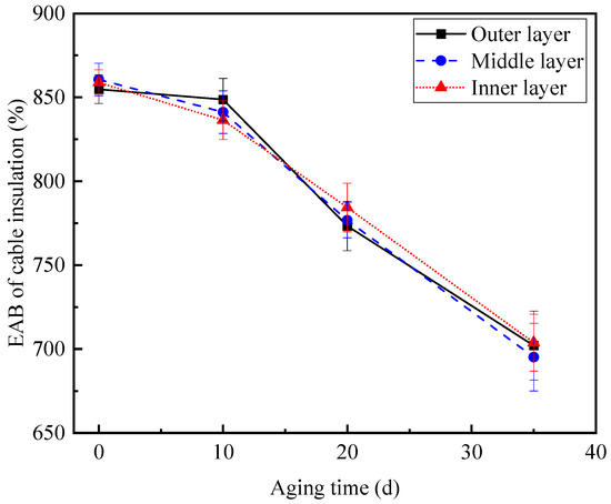 Firstly, the mechanical properties of the dumbbell-shaped specimens of the outer, middle and inner insulation layers with an aging time of 0 d, 10 d, 20 d and 35 d were tested, respectively. The results of the EAB and the corresponding variance of the aging cable insulation at different positions versus aging time are presented in Figure 6.