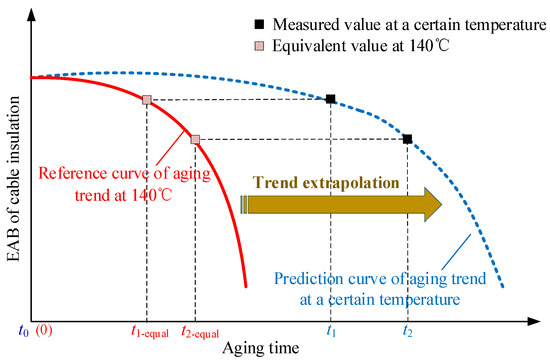 To solve this problem, a calculation method for the multiplicative shift factor of XLPE distribution cables was proposed. According to the basic idea of the TTSP, for XLPE cable insulation, in which the Arrhenius extrapolation assumptions have been verified to be applicable, the degradation curves at different aging temperatures would have the same shape when plotted versus the log of the aging time, and could be converted to each other by using empirical shift factors. That is, the ratio of the time spent when the EAB of the cable decreases to an arbitrary value at a certain aging temperature to the time spent when the EAB of the cable decreases to the same value at the reference temperature is equal to the corresponding multiplicative shift factor . Thus, taking the schematic diagram in Figure 8 for example, the following calculation process for can be conducted. Firstly, the specific time t0 when the cable is put into operation can be obtained by querying the cable installation files. Then the value of the EAB of the cable insulation (EAB1) can be measured and obtained by taking samples from service-aged cables during the period of maintenance, and the corresponding time is recorded as t1. After that, The EAB1 value is substituted into the reference trend curve of cable thermal aging to calculate the corresponding aging time spent t1-equal. Finally, the multiplicative shift factor can be obtained by the ratio of t1-equal to (t1 − t0).