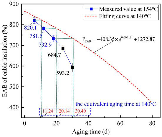 The multiplicative shift factors deduced based on the TTSP are 1.873, 1.678 and 1.689 when the aging time is 6 d, 12 d and 18 d, respectively. The standard deviation of these three data points is 0.089, demonstrating the stability of the proposed method for converting the aging trends at various temperatures. Then, the average value was further calculated and set as the final multiplicative shift factor at the aging temperature of 154 °C, which was 1.747. On this basis, combined with the prediction equation for the aging trend at 140 °C in Equation (10), the EAB of aged cable insulation with the aging time of 24 d and 30 d at 154 °C can be respectively deduced and predicted, as shown in Table 2.