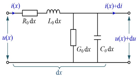 As illustrated in Figure 10, the distribution parameter model could be used to describe the electrical network structure of power cables under a high frequency power source according to the transmission line theory [21]. R0, L0, G0 and C0 represent the equivalent resistance, inductance, conductance and capacitance of the power cable per unit length, respectively, and they can be calculated according to the material, size, structure and other parameters of the power cables. x is the distance from the cable head end.