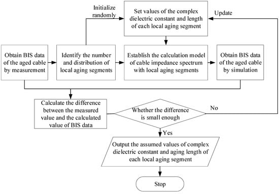 Firstly, BIS data of the aged cable could be obtained by measurement, then the number and distribution of local aging cable segments would be identified according to the literature [21]. Then values of the complex dielectric constant and length of each local aging segment are randomly set (each cable segment can be described by four unknown parameters, including constants C, D, P and length l). It should be noted that the calculation model of the cable impedance spectrum with local aging segments would be established and then the calculated values of BIS data would be obtained. After that, the difference between the measured value and the calculated value of BIS data are calculated; if it is not small enough (usually being compared with a pre-set termination criterion), values of the complex dielectric constant and the length of each local aging segment would be reset, and the previous steps would be repeated. The iteration is carried out until the termination criterion is met. In this situation, the values of the complex dielectric constant and aging length of each local aging segment would be output, which is regarded as the corresponding actual values.