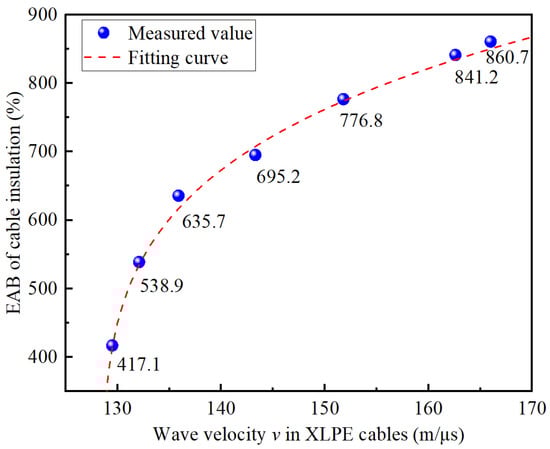 It has been found that there is a monotonic relationship between the wave velocity in the cable and the corresponding EAB value [26]. Referring to the accelerated aging experiment condition and testing process in literature [26], the relationship between the wave velocity in the cable and the corresponding EAB value was further established, as shown in Figure 12.