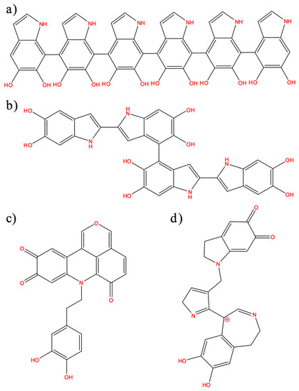 - Chen, C.-T.; Martin-Martinez, F.J.; Seob Jung, G.; Buehler, M.J. Polydopamine and eumelanin molecular structures investigated with ab initio calculations. Chem. Sci. 2017, 8, 1631–1641. [Google Scholar] [CrossRef] [PubMed]