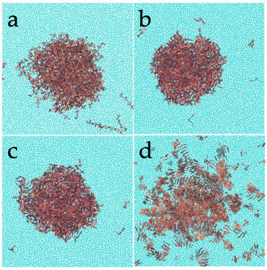 All the simulations were performed with the NAMD software [49] and the OPLS-AA force-field [50]. The TIP3P model was used for water molecules. Parameters for the simulations were obtained with the LigParGen web-based service [51,52,53]. The visualization and analysis of the results were performed with VMD [54], while PACKMOL [55] was used for the generation of bulk and solution-initial geometries.