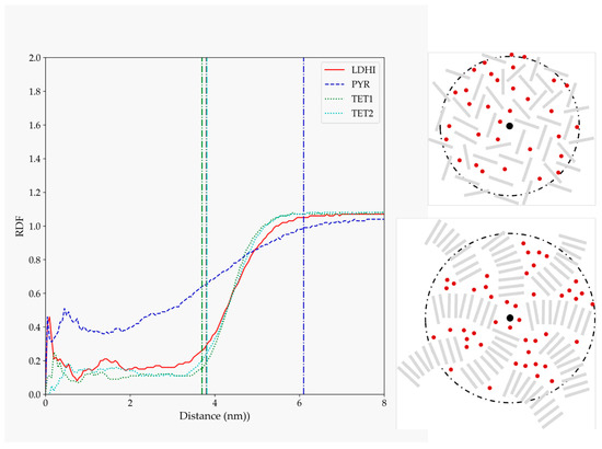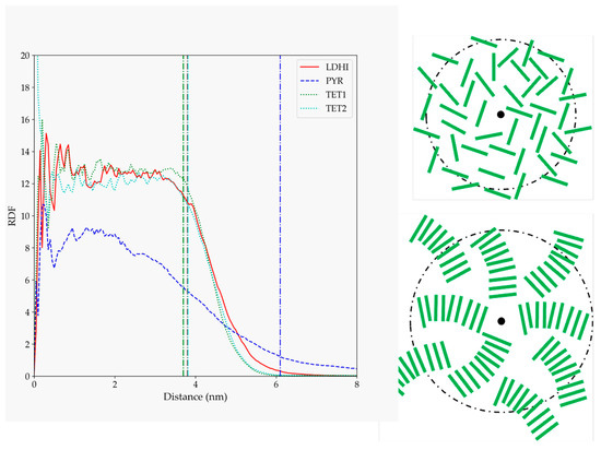 RDF for PDA atoms relative to the position of the nanosphere center of mass for the four models considered in solution (lDHI: red; PYR: blue; TET-1: green; TET-2: cyan). All the profiles are averaged for the three configurations generated for each model. The vertical lines indicate the average approximate value of the radius of gyration for each of the systems. The schemes on the right are simplified depictions proposed for lDHI, TET-1, and TET-2 (top), and for PYR (bottom) from the overall geometry and the RDF profiles.