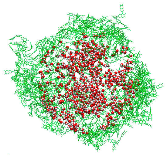 Distribution of water molecules within a PDA nanosphere in the TET-2 model. In green are displayed the outer TET-2 oligomers to indicate the dimensions of the nanosphere.