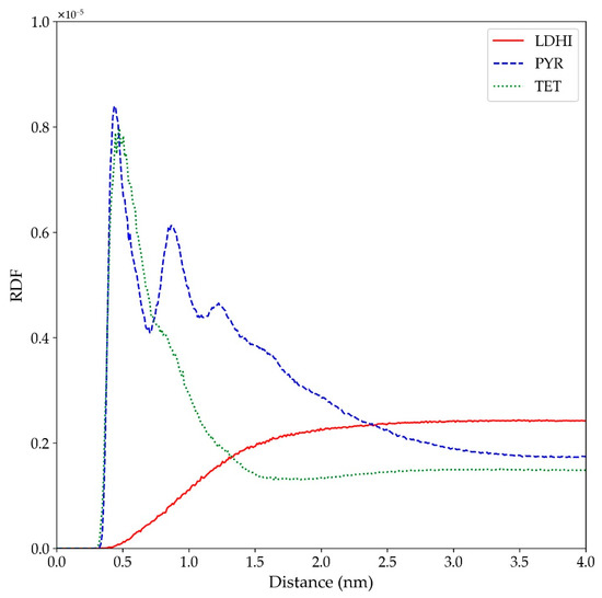 In a similar fashion as with the simulations for the smaller nanospheres, the occurrence of π-π stacking interactions in the larger models was investigated to get a better comparison with some of the experimental evidence. In particular, the stacking between units in the larger nanospheres was analyzed in terms of the pair-pair radial distribution function, computed in terms of the centers of the rings in each unit. The results are displayed in Figure 10 and reveal an extensive stacking between different molecules for the PYR model, covering up to 3 to 4 stacked units (as shown by the peaks in the corresponding distribution). On the other hand, the degree of stacking is much smaller for TET, mainly up to two units, while for lDHI it is practically non-existent. Therefore, it can be said that the PYR-based model is the one that displays a more planar conformation. More importantly, it is the one that exhibits a larger degree of aggregation with π-π interactions and, therefore, better agrees with NMR-based observations [43].