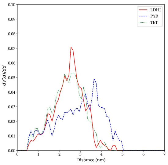 Indeed, the extensive stacking in the PYR-based model appears to play an important role in the general features of the nanosphere, specifically in the degree of water penetration within the aggregate. As illustrated in the morphologies in both Figure 3 and Figure 8, the π-π interactions in PYR favors the formation of vermicular aggregates that assemble together to form a nanosphere with large portions of empty space that can be occupied by water. Such an arrangement is clearly different from the DHI-based models, which exhibit a uniform distribution of units. The structural details of these free space (or cavities) have been characterized in terms of a pore size distribution (PSD) analysis, using the PoreBlazer v4.0 software [61]. In this method, which has proven useful for the analysis of polymer systems [62,63], a given configuration is mapped to a lattice grid, and a hard-sphere probe is used to locate and measure free spaces (cavities or “pores”). In this study, the PSD analysis was carried out for the inner region (a cube with a side length of 20 nm) in the final configuration of each large nanosphere model. The results, shown in Figure 11, indicate that the most probable free space size for lDHI and TET is about 2.5 nm in diameter, while cavities with a maximum of about 4 nm were observed for the PYR nanosphere (right side of Figure 8).