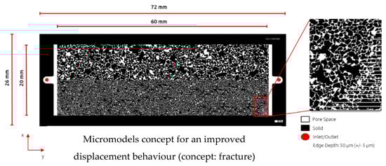 Micromodel Generation and Setup: Within this work, we customized and build a dual-permeability micromodel to mimic the heterogeneity of the reservoir. Furthermore, this enables us to screen the displacement efficiency of chemicals in a heterogenous formation. The micromodel dimensions are 60 × 20 mm, with a permeability contrast of 1:5 between the two zones. Micromodel generation and characterization were done by the same principle previously reported by Hincapie et al. []. Figure 1 displays the micromodel geometry and properties accordingly.