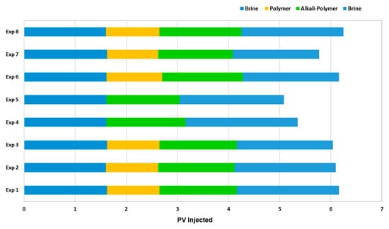 Core Flooding Experiments—Sequence of Events: Multiple fluid slugs were injected at an interstitial velocity of 1 ft/day, as shown in Figure 3. First, brine (8 TH RSB) was injected as slug 1 for all experiments for a 1.6 pore volume (PV) as a secondary mode. Second, polymer flooding was implemented as slug 2 (except Exp. 4 and Exp. 5) and was defined as a tertiary mode. Third, the alkali–polymer chemical slug was injected as a post tertiary mode (except Exp. 4 and Exp. 5) for 2 PV. Lastly, brine injection was implemented for 2 PV as a final slug for all experiments (diluted in synthetic brine 8 TH RSB). Core plugs/sand packs were unloaded after the flooding experiments to perform the Dean–Stark procedure. Final saturations (recovery factors) of the fractions’ collector samples were validated with Dean–Stark volumes. Core flood effluents from core plugs/sand packs were collected in small glass fraction tubes to perform volumetrics and to generate the produced oil recovery curve versus injected PV. Moreover, pressure differential data were recorded for all injected slugs.