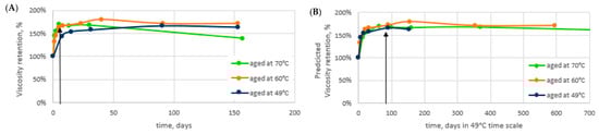 Thermal Aging: Long-term aging in the alkaline conditions was studied to find out the long-term polymer performance in AP applications. A rapid increase in the viscosity of the 2000 ppm solutions was observed during the first days at elevated temperatures (Figure 4A). The increase was linked to a fast change in the degree of hydrolysis providing a positive impact on viscosity in the soft brine. A more detailed description of the studies can be found in [,]. Even though the field temperature in Matzen is 49 °C, the aging was also carried out at 60 °C and 70 °C to accelerate the aging. We showed in [,] that the activation energy Ea = 110 kJ/mol, determined earlier for HPAM hydrolysis in neutral pH 6–8. Nurmi et al. [] also applied it in the case of a high pH. With the knowledge of the activation energy, the aging results measured at one temperature can be transferred to the prediction at another temperature with the method described by Nurmi et al. []. Based on the activation energy, or Ea = 110 kJ/mol, the viscosity retention results in Figure 4A have been transferred to a corresponding time scale at 49 °C in Figure 4B.