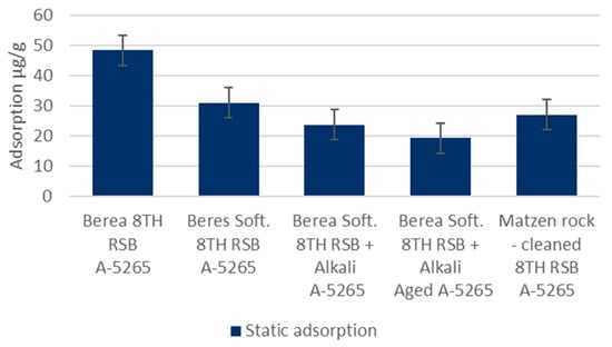 Static Adsorption: Static adsorption experiments were carried to obtain insight into the adsorption phenomenon as a function of changing brine, pH, polymer charge, and rock material conditions. The results are presented in Figure 5. The trend in crushed Berea is clear. The adsorption decreases as the brine gets softer and the pH increases. Increasing the charge of the polymer in the softened brine conditions also appears to continue the positive trend. The lowest adsorption value measured was 19 µg/g. Adsorption in the actual cleaned Matzen rock material indicates even lower values. The adsorption in the 8 TH RSB brine was measured to be approximately half of that in the case of Berea: 27 µg/g vs. 48 µg/g, respectively. When applying the softer water with a pH increase in the Matzen rock, the adsorption could be expected to go even lower than with Berea, assuming a similar response to the change in conditions, as in the case of Berea. These values were not measured. Further considerations on the adsorption in the absence of oil can be found in [,].