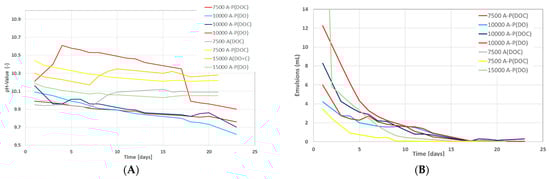 Change in pH value and emulsion volume over time for the phase behavior tests at different concentrations of chemicals. (A) Change in chemical formulation over number of days. (B) Change in produced emulsion volume over number of days. A refers to alkali concentration in ppm, P stands for polymer concentration of 1850 ppm, (DOC) represents dead oil with cyclohexane, and (DO) represents dead oil.