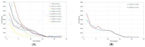 IFT variation over time (days) for the tested formulations in the phase behavior tests. (A) IFT versus time for various concentrations and (B) IFT versus time for 10,000 AP to show the data reproducibility. A refers to alkali concentration in ppm, P stands for polymer concentration of 1850 ppm, (DOC) represents dead oil with cyclohexane, and (DO) represents dead oil.