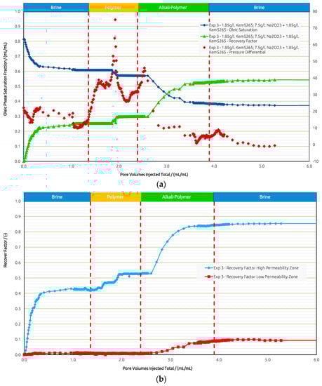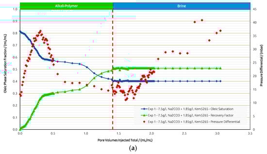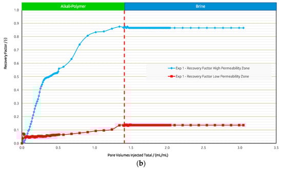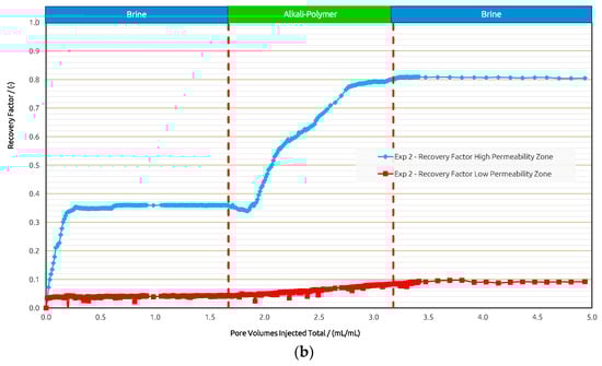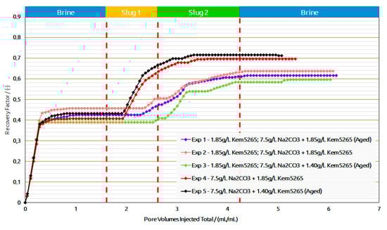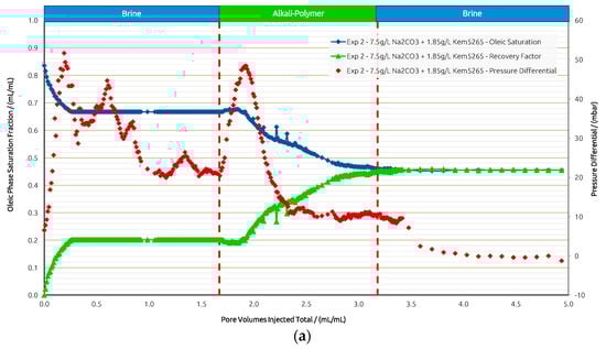 Core Flood Experiments in Outcrops: Table 9 provides the summary of the flooding experiments performed in the Berea samples. Exp. 1 and Exp. 2 compared the role of the aging process for AP formulation as shown in Figure 14a,b. The oil recovery factors from brine flood in secondary mode were the same (≈3% difference). Interestingly enough, a similar trend of oil recovery (≈0.2% difference) from polymer flood was observed. The AP slug viscosity for Exp. 1 (38 mPa.s) is significantly higher than the one in Exp. 2, due to the thermal aging of the samples, which we previously reported in [,]. However, there was no significant oil recovery difference from the AP slugs in both experiments.