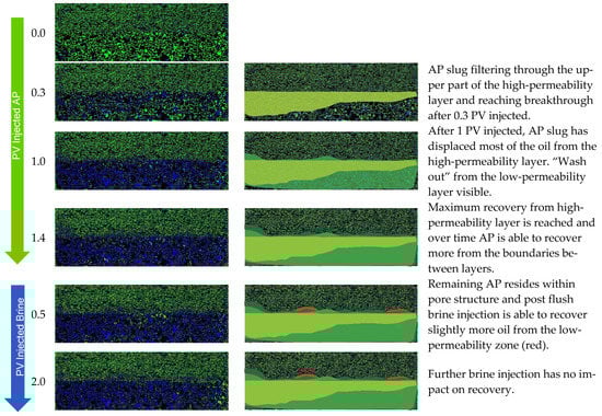 For Exp. 2 (Figure 11) we introduced a brine injection prior to the AP. The first brine injection yielded an RF of 21%, followed by the AP slug, which recovered an additional 25%. The pressure differential increased almost twofold when injecting the AP; yet, after all the oil was mobilized, injectivity improved and reached values even below the previous brine injection. The final post brine flush did not recover barely any additional oil (1%), and the pressure dropped slightly further. Looking at the recovery from the two layers separately, the scenario in Exp. 2 shows a slightly worse performance compared to Exp. 1. In the high-permeability layer, the AP reached an additional RF of 45% after brine, while 5% was recovered from the low-permeability layer by the AP. Overall, the injection of the AP in secondary mode has been shown to be more effective in terms of the RF, and the “wash out” from the low-permeability zone at the layer boundaries was more efficient.