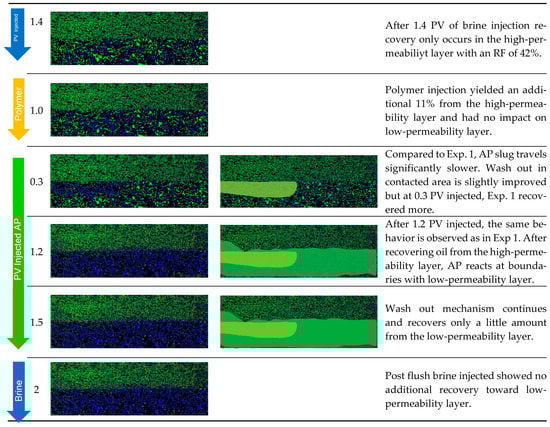 In Exp. 1, the AP slug was injected in secondary mode to obtain a general idea about the fluid–fluid interactions between the AP and oil. The injection of the AP slug yielded an RF of 49% within the entire chip. This moderate desaturation performance is due to the remaining oil saturation (Sor) in the low-permeability zone. Thus, the analysis of the results focused on both regions separately.
