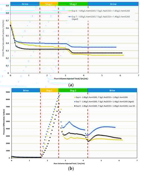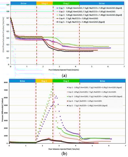 Exp. 4 and Exp. 5 were only performed with an AP slug after a brine flood. The RF of the brine flood was in line with the previous experiments, but the AP formulation efficiency was better than the previous three experiments and resulted in 27% additional oil recovery. Exp. 4 and Exp. 5 concluded that, without a polymer slug prior to AP, the chemical interactions between the oil and the formulations were effective; hence, they resulted in better phase behavior interactions. Moreover, pressure drops for both experiments (4 and 5), as shown in Figure 14 were much lower than the previous experiments due to the absence of the pre-polymer slug. The oil recovery factor/reduction in oil saturation and pressure drop comparison between Exp. 4 and Exp. 5 confirmed that a good utility factor can be achieved by the aging process of the low-concentration AP slug.
