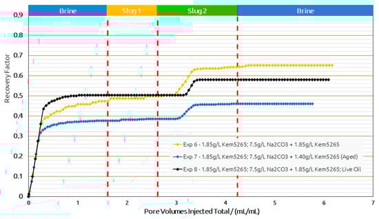 Recovery factor versus pore volumes injected total for the different slugs for core floods in real rock sand packs. Exp. 6 and 7 performed with dead oil and Exp. 8 with live oil.