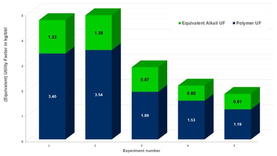 The EqUFs for the injection of the aged and non-aged polymers with alkali for experiments 1–5 are shown in Figure 18. The EqUFs can be used to compare different chemical agents. Figure 18 shows that higher EqUFs are observed for experiments in which the aging of the polymer in an alkali solution in the reservoir was not accounted for. Reducing the polymer concentration in Experiment 3 (Figure 18) leads to a decrease in the EqUF by 40%. If the alkali–polymer is injected immediately without a prior polymer slug, then the economics are improved by 37% compared with the case (comparing Experiment 5 to Experiment 3). This is a good indication that it is beneficial to inject the alkali–polymer immediately rather than to start chemical EOR with a polymer injection. In the field test planned for the 8 TH reservoir, an area has been selected with an ongoing polymer flood for operational reasons, the roll out will be in an area of the field which is operated using waterflooding. The UFs of the polymer flood prior to the alkali–polymer are high, ranging from 9 kg/bbl. to 16 kg/bbl. for Experiments 1 to 3. The reason is the limited incremental oil observed in the experiments for polymer flooding. This shows the potential of the alkali–polymer EOR for reactive oils.
