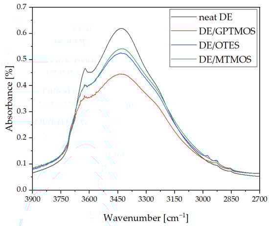 FT-IR analysis of the neat diatomaceous earth (DE) and silane-modified diatomaceous earth (DE/OTES, DE/GPTMOS, and DE/MTMOS) was carried out (Figure 2). The analysis showed differences in band intensities after the silanization process. A reduction in the -OH stretching band surface area in the 3000–3700 cm−1 range and the appearance of a -CH stretching band in the 2800–3000 cm−1 range after the silanization process were observed, with the strongest effect seen for the GPTMOS and similar observations recorded for the other two silanes (OTES and MTMOS). These features confirm the successful silanization reaction of the diatomite surface.