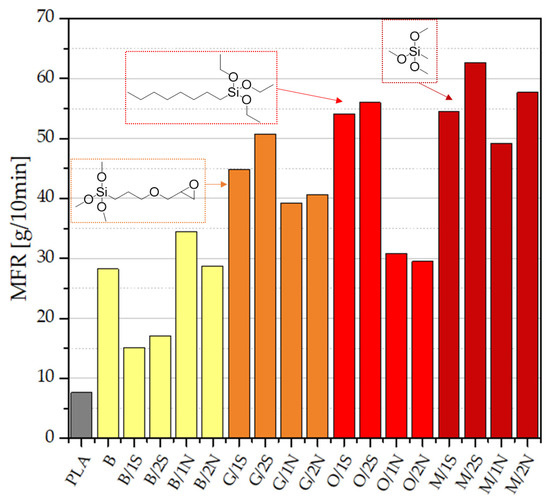Neat, unmodified PLA has a melt flow rate (MFR) of 7.6 g/10 min, which is consistent with reports in the literature [24]. Modification of the PLA with diatomaceous earth in each case resulted in a significant improvement in the processing parameters, which was also observed in our previous work [23] (Figure 3). The positive effect of the addition of waxes on the magnitude of the MFR parameter is clearly visible—as little as a 1% addition of synthetic wax resulted in a two-fold increase in MFR (B/1S). The highest result for the composite containing unmodified diatomaceous earth was achieved for a 1% concentration of beeswax (B/1S, MFR = 34.5 g/10 min). Further increases in the concentration of wax in the system resulted in a slight, in most cases further, increase in MFR values. Preparation of samples of composites containing silane-modified diatomaceous earth (GPTMOS, MTMOS, and OTES) produced a positive effect on the melt flow rate, i.e., MFRs in the range of 29.5–62.7 g/10 min. Modification of the systems with MTMOS resulted in the greatest changes in melt flow rate, reaching values of up to 62.7 g/10 min, which caused minor difficulties in obtaining composites by injection molding. The difference between the MFRs of the O/xS and O/xN systems were due to the effect of the nonpolar octyl-substituted silane displacing the more polar, synthetic wax from the filler to the polymer phase, while the highly apolar synthetic wax (being composed mostly of fatty acid esters of long-chain alcohols [25]) was likely in higher concentration at the filler surface or filler-matrix interphase. On the other hand, more polar methyl-substituted silane in the M/xS and M/xN systems did not result in such behavior to a meaningful extent.
